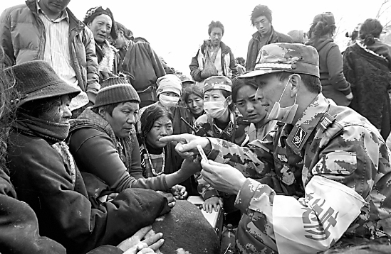 地震发生后,公安边防部队医疗救护队组织多个医疗小分队,带着各种医疗和防疫药品,为灾区群众看病治病,并走村入户宣传防疫知识。