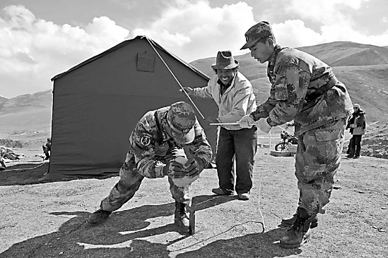 解放军救援部队在灾区偏远乡镇帮助受灾群众清理废墟,搭建帐篷,运送生活物资。