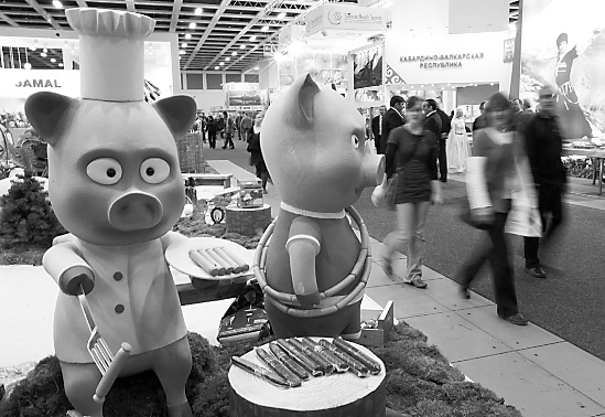 | 1月21日,世界最大的农业和食品博览会“柏林国际绿色周”正式对外开展。“柏林国际绿色周”每年举办一次,今年是第76届,本届博览会重点关注食品安全,共有来自57个国家的1600多家展商参展。图为人们从俄罗斯馆的一组雕塑旁走过。 据新华社 |