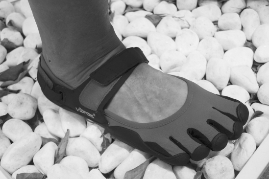 | “五指鞋” 在北京举行的国际健身大会上,工作人员踩在石子上展示“五指鞋”。据介绍,“五指鞋”又名“橡胶五指袜”,鞋底按照人的足型设计,以五个脚趾的形状分开一次成形,鞋面由透气面料缝制而成,可为健身者带来赤脚般走路的新鲜感受。 新华社 发 |