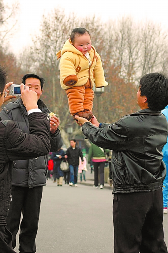 1月22日下午,在断桥上,第一次来杭州西湖游玩的小龙龙,站在家人手掌上拍照的姿势吸引了许多游人的眼球。小家伙来自河南,才6个月大,可腿劲十足,站在大人手掌上虎头虎脑的样子,引得家人和游客哈哈大笑。 连国庆 摄