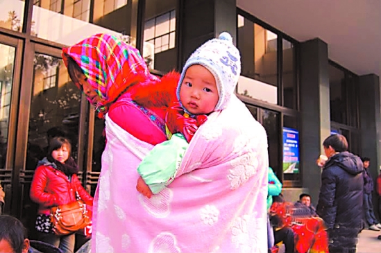 1月21日,是春运第三天。风小了,雪止了,杭州火车南站迎来了客流高峰。这位母亲说:“有钱没钱,都要回家过年,我背后的宝宝是带给老人的最好礼物。” 傅灿亮 摄