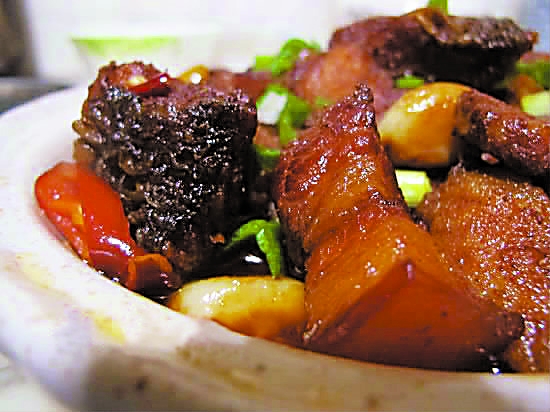 | 材料:草鱼一条(约750—1000克),五花肉约500克。 做法: 1、草鱼洗净,切成麻将大小的块状,用黄酒一大勺、盐一小勺、麻辣鲜 一小勺,腌制30分钟; 2、五花肉切成与鱼块大小差不多的块状,洗净焯水,出锅备用; 3、炒锅洗净,放少许油,放入冰糖熬糖色,倒入五花肉爆一下,至表面微焦,倒入黄酒20毫升、老抽少许,炒匀。 4、加温水没过五花肉2厘米左右,大火烧开转小火慢煮。 5、另用一只锅开始炸鱼块。鱼块炸至表面焦黄即可出锅。留适量油,将朝天椒、蒜和姜倒入煸炒出香味。 6、倒入蒜蓉辣酱和少许老抽,炒匀;倒入鱼块炒匀。然后将五花肉连同汤汁一起倒入,转小火焖20分钟; 7、将尖椒倒入,加少许盐和味精调味,再焖5分钟即可,临出锅撒些蒜末或香菜之类的。 |