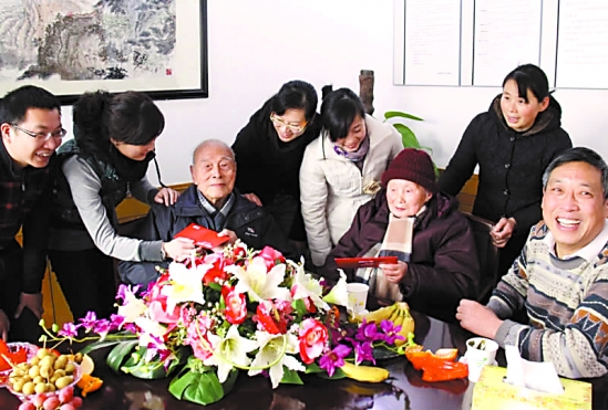 春节前,杭州市凯旋街道两位百岁老人102岁的徐佩璜和105岁的汤锁娣(女)聚会。街道和社区工作人员闻讯,赶去给老寿星拜年。