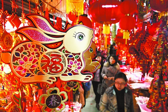 1月31日,市民在杭州环北市场选购兔年装饰品。 屠春 摄