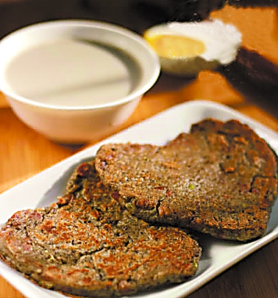 | 黑豆浆+黑豆培根饼 原料:干黑豆60克。 辅料:培根3片、葱花1大勺、普通面粉2大勺、盐1/2小勺。 做法: 1、黑豆洗净后用清水浸泡4小时以上,把黑豆放入豆浆机,里面放入适量清水。 2、豆浆磨好后,用细网的勺子把豆浆中的豆渣捞出来,留下香浓的黑豆浆。 3、培根切成小丁,用煎锅煎熟;把煎熟的培根、豆渣、葱末放在一个大碗中。再调入一点盐。 4、加入面粉,搅拌均匀,调成比较黏稠的豆渣糊糊,把面糊摊平在煎锅里。正、反两面各煎制2分钟左右即可。 |