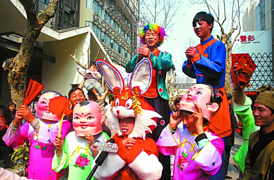 一群大头娃娃,把河坊街闹得热气腾腾。男女老少看得乐不可支,一路尾随,希望演员摘下面具,一睹真容。 连国庆 摄