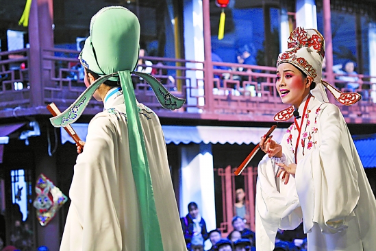 “三载同窗情如海,山伯难舍祝英台,相依相伴送下山,又向钱塘道上来。”这《十八相送》越剧经典唱段,迎来台下票友掌声不断。过年看戏是杭州市民的传统方式,春节长假期间,黄龙洞景区好戏连番上演,为市民带去了丰富的节日文化大餐。图为杭州黄龙越剧团演唱的《十八相送》。 屠春 摄