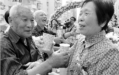 9月28日,舟山市普陀区鲁家峙社区请来19对钻石婚和36对金婚老人,给他们戴大红花、吃生日蛋糕、送长寿面,并请他们重饮交杯酒。580多名60周岁以上老人以茶话会形式,载歌载舞为获钻婚、金婚老人祝福,同庆重阳节。