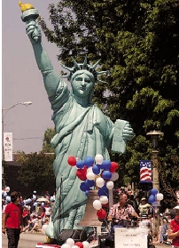 七月四日是美国国庆日,充气自由女神像在洛杉矶南帕沙迪纳游行欢庆队伍中高高耸立。