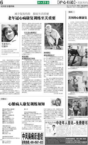 “我们一直在灌输和强调老年冠心病患者应该趁早介入康复训练,因为康复训练可以降低再住院率和住院时间,改善血压、血脂、血糖,改善患者的精神和心理状态,提高生活质量。”浙江医院心血管内科主任医师任爱华告诉记者。
