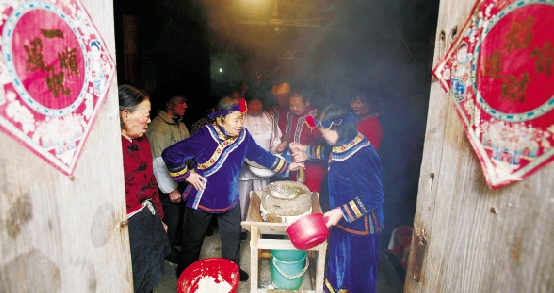豆腐,斗福,或许是因为谐音,豆腐也被赋予了吉祥含义,于是便有了“腊月二十五,推磨做豆腐”的民谚。图中浙江景宁畲族自治县梧桐乡的人们正在磨豆腐,喜迎春节的到来。官伟/摄