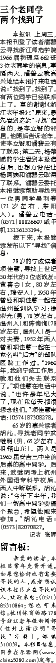 本报讯 上周三,本报刊登了读者潘碧云寻找浙江师范学院1966届物理系662班3位老同学的信息,事隔两天,潘碧云就高兴地给本报打来电话说:“找到了,找到了,有两位同学已经联系上了。真的谢谢《浙江老年报》!”原来,最先看到这条“寻找”信息的,是李立锵的邻居,他随后告诉老李,使李立锵和潘碧云有了联系;第二天,杨菊娣的学生看到本报信息后,也想方设法让杨阿姨和潘碧云取得了联系。潘碧云委托本报继续帮助寻找另一位男同学吴利春(71岁左右,东阳人)。潘碧云电话:(0571)88826607或手机13136153194。
