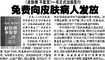 为了配合皮肤病防治公益事业,普及皮肤病常识,现在全国免费发放皮肤病研究最新成果实用书籍,本省读者可拨打免费电话400-073-6388进行索取,数量有限,发完为止。