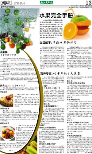 很多人都因为担心水果皮里含有农药残留,而把果皮削去。冯慧川觉得这样做太可惜,因为水果皮和其皮下部分往往是营养最丰富的部分。大家不用过分担心果皮上的农药残留,在挑选水果时可以挑选有自然果香的水果,而不是外表很亮的水果。如果农药有残留,那么不仅在果皮上,整个果实都是有的。因此,吃前可以用面粉洗水果,或者多浸泡一会儿,这样可除其表面残留物质。如果一定要削皮,尽量削得薄一点。 记者 唐佳璐