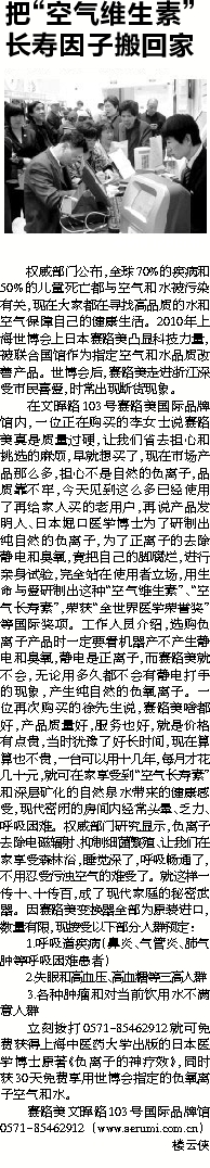权威部门公布,全球70%的疾病和50%的儿童死亡都与空气和水被污染有关,现在大家都在寻找高品质的水和空气保障自己的健康生活。2010年上海世博会上日本赛路美凸显科技力量,被联合国馆作为指定空气和水品质改善产品。世博会后,赛路美走进浙江深受市民喜爱,时常出现断货现象。