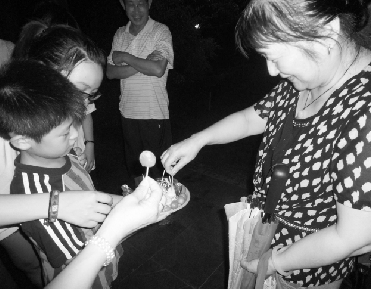 杭州华星社区和杭师大外国语学院的志愿者们,在嘉绿苑公园里开展主题活动,一起学跳美国乡村舞蹈,学做具有西方特色的食物。图为志愿者和小朋友们请社区老人品评刚刚做好的水果沙拉。