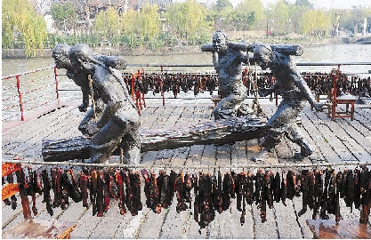 随着新年脚步的临近,许多家庭忙着晒年货。在杭州小河直街“运河码头搬运工人”雕塑两边,整整齐齐地挂满了酱肉,煞是壮观。太阳一晒,红彤彤地透着光,让人眼馋。 西子 摄