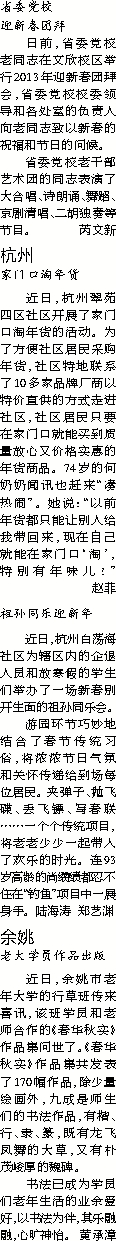 日前,省委党校老同志在文欣校区举行2013年迎新春团拜会,省委党校校委领导和各处室的负责人向老同志致以新春的祝福和节日的问候。