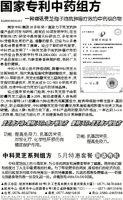 南京中科集团20多年来一直致力于灵芝抗肿瘤产品的开发与研究,拥有近50项发明专利,在生物制剂(药)研发中具有强大科研实力,多年来中科凭借其优质的产品、温馨的服务,已经为众多患者和消费者带来了健康。经过不断的研究探索,中科药业发明了“一种灵芝孢子油抗肿瘤疗效的中药组合物发明专利号ZL20041001 4120.3”,该产品自面世以来,为新老患者保驾护航,受到广大患者的青睐。
