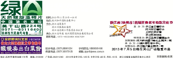 地址:杭州市体育场路178号 邮编:310039 广告部:85311240 2013年全年订价:120元 半年订价:60元 月价:10元 浙江日报报业集团印务中心承印