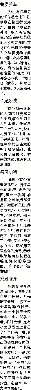 有个叫朱评温的人,前去拜支离益为老师,潜心学习杀龙的本领。他耗尽了千金的家产,苦心花费了3年时间,终于学成回来。然而,他寻来找去连龙的影子也没见到。他化费了昂贵代价学来的本领,竟没有丝毫用处。