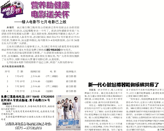 本报讯 由云南生物工程有限公司和浙江老年报联合主办的首届《绿A电影节》活动,已经整整举办一个月了。该活动为感谢多年来广大读者对老年报和绿A品牌一直以来的支持,特放映每月最新上线大片,针对老年人和年轻人各有专场,活动时间从2013年6月1号开始至12月31日结束,为期半年,如无意外情况,每月都有3~4场电影放映,合计有24部左右大片回馈广大读者。