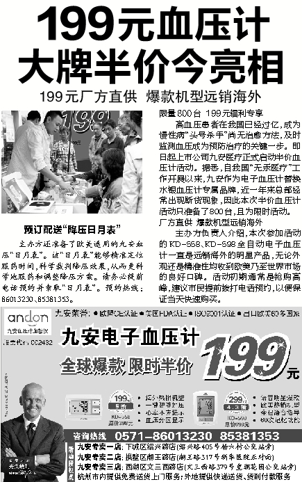 主办方负责人介绍,本次参加活动的KD-558、KD-598全自动电子血压计一直是远销海外的明星产品,无论外观还是精准性均收到欧美乃至世界市场的良好口碑。活动初期通常是抢购高峰,建议市民提前拨打电话预约,以便保证当天快速购买。