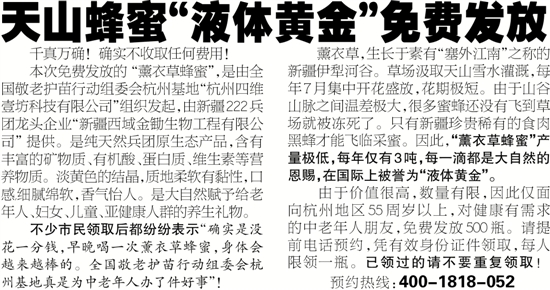 由于价值很高,数量有限,因此仅面向杭州地区55周岁以上,对健康有需求的中老年人朋友,免费发放500瓶。请提前电话预约,凭有效身份证件领取,每人限领一瓶。已领过的请不要重复领取! 预约热线:400-1818-052