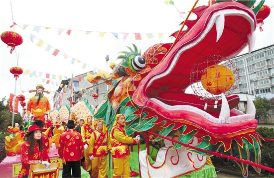 2月27日,瑞安市陶山镇桐浦社区,68米巨龙绕村巡游吸引众村民翘首观看。