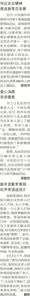为了让社区的空巢老人过一个快乐的元宵,近日,杭州长寿社区的社工及志愿者为社区老人送上了暖心汤圆。有老人说:“这一颗颗的汤圆,是一份份心意,一声声的问候,更重要的是让我们感受到了浓浓暖意和深深关怀。”