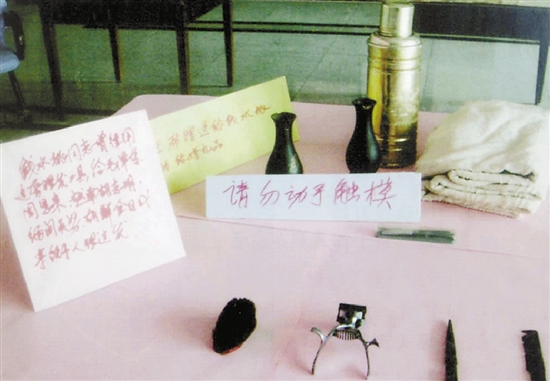 毛主席送给钱水桃的结婚礼物:钢笔、毛毯、热水壶、花瓶。前面是钱水桃当时给毛主题理发使用的工具,钱水桃当时用这套工具给周恩来、胡志明、金日成也理过发。