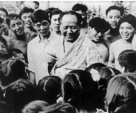 钱水桃在湖南长沙橘子洲头和毛主席一起游泳上岸时留影(右一为钱水桃)