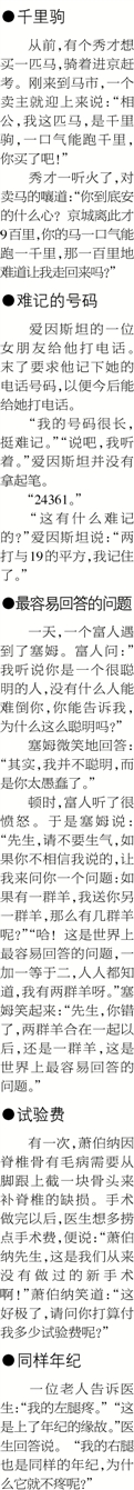 有一次,萧伯纳因脊椎骨有毛病需要从脚跟上截一块骨头来补脊椎的缺损。手术做完以后,医生想多捞点手术费,便说:“萧伯纳先生,这是我们从来没有做过的新手术啊!”萧伯纳笑道:“这好极了,请问你打算付我多少试验费呢?”