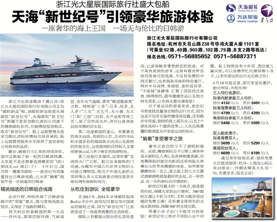 最近,随着日元汇率的持续走低,国内又掀起了新一轮的日韩游热潮。大家是不是还想着选择哪家的飞机?那就太out(落后)了! 5月23日,国内第一艘豪华邮轮——新世纪号将隆重推出日韩游线路,让大家“躺着”就能享受一次超值的日韩游!