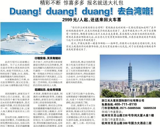 目前,海娜号5月4日台湾游线路正在火热报名中,名额有限,敬请大家及时咨询报名。现在报名,海娜号还将为大家赠送贴心的大礼包:厦门车游环岛路,参观南普陀寺,杭州-厦门、上海-杭州往返火车票。