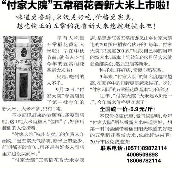 “付家大院”杭州专卖店的负责人介绍说:“受五常天气影响,新米上市量少,前期都不敢宣传,可还是有好多人到店里来也没买到米。”