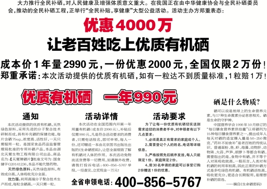 本次活动在全国范围内开展一年用量有机硒(成本价2990元),补贴后仅需990元,凡是符合活动要求的消费者,只需电话报名,即可申领,每人一份,还可赠送一本由北京图书出版社出版的《生命硒密码》,让您全面细致了解有机硒对人体的作用。本次活动免物流送货费等一切费用,如遇额外收费,请拨打投诉电话:400-856-5767举报,一经查实,立奖现金一万元!