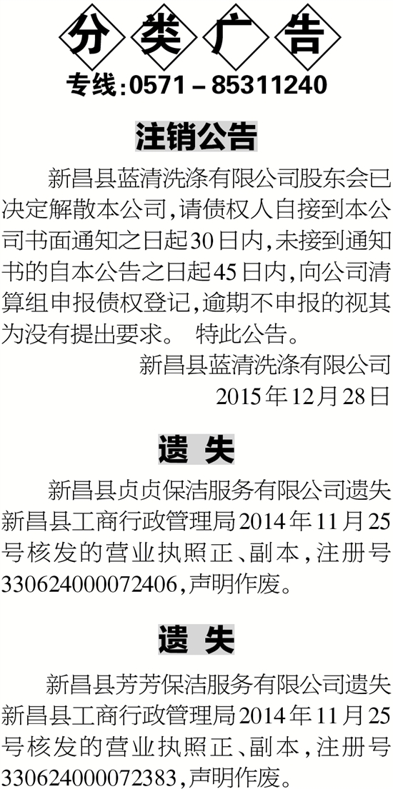 新昌县蓝清洗涤有限公司股东会已决定解散本公司,请债权人自接到本公司书面通知之日起30日内,未接到通知书的自本公告之日起45日内,向公司清算组申报债权登记,逾期不申报的视其为没有提出要求。 特此公告。