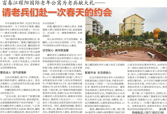 据了解,为了感恩老兵、回馈社会,曜阳国际老年公寓除了邀请老兵们游黄公望故居、观富春江山水、品老年公寓之外,还将送上一份属于曜阳的爱心大礼。如果你是老兵,或者家有老兵,欢迎报名参加这场春天的约会。 徐小翔