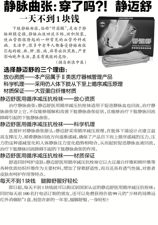 即日起,每天不到1块钱就可以购买到国家认证的静迈舒医用循序减压抗栓袜;同时每天前100名打电话订购的朋友,还可以免费获得价值99元的“少林药局牌远红外消痛贴”1盒,祝您在新的一年里,腿脚舒服、一身轻松!