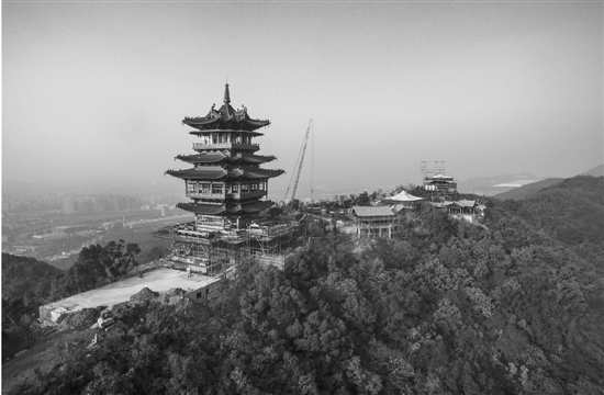 12月7日,在杭州半山国家森林公园,刚刚建成的望宸阁在夕阳下绽放雄姿。这个作为的望宸阁,高约42米,建在海拔280米的山顶上,将成为市民游客新的登高观光地。