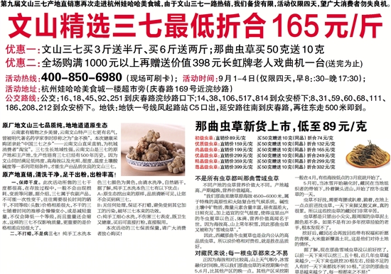 第九届文山三七产地直销惠再次走进杭州娃哈哈美食城,由于文山三七一路热销,我们备货有限,活动仅限四天,望广大消费者勿失良机。