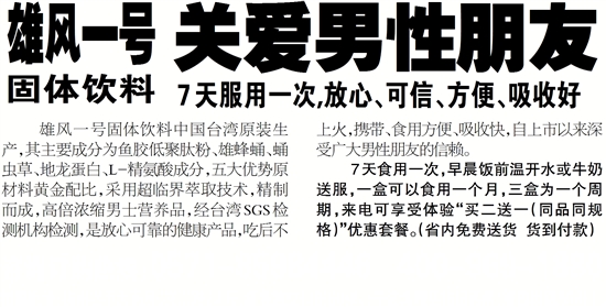 雄风一号固体饮料中国台湾原装生产,其主要成分为鱼胶低聚肽粉、雄蜂蛹、蛹虫草、地龙蛋白、L-精氨酸成分,五大优势原材料黄金配比,采用超临界萃取技术,精制而成,高倍浓缩男士营养品,经台湾SGS检测机构检测,是放心可靠的健康产品,吃后不上火,携带、食用方便、吸收快,自上市以来深受广大男性朋友的信赖。