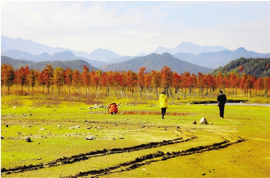 台州市黄岩区宁溪镇上垟水库,水库周边有几处小水杉林,由于水库上游水量减少,水杉根系露出了水面,库底形成了草地,颇有一种草原之境。冬日来临,夕阳西下,水杉树叶变成了红色,远远望去,恍然进入一处人间仙境。 通讯员 陈学德 林汝秋 摄