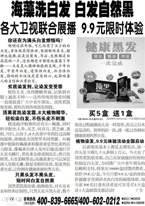 以前染发基本上都是去理发店,染一次头发少则几十元多则上百元。今天有了顶黑茗凯染发霜,自己在家就能好轻轻松松搞定白头发,为回馈广大中老年朋友的信赖和支持,特拿出10000盒回馈消费者,原价19.8元/盒,今天只要9.9元/盒的体验价就能享受到清水洗白发的超值体验,每天前100名打进电话者还可享受买5大盒送1大盒超值优惠活动! 广告
