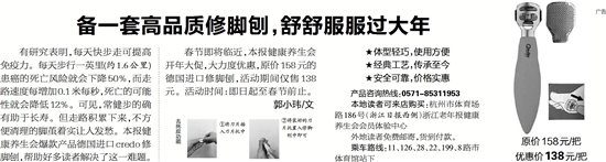 春节即将临近,本报健康养生会开年大促,大力度优惠,原价158元的德国进口修脚刨,活动期间仅售138元。活动时间:即日起至春节前止。 郭小玮/文