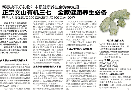 “平时听周围人提三七挺多,但没见过实物,只听说作用很多。”家住朝晖的刘先生说,前段时间想给父母买点三七,也去过很多地方,但有点不放心,最终没买。看到本报健康养生会云南文山直供三七,且是有机的,有国家标准和权威机构检验,品质有保障。“我先买点试试,送给老人,尽一份孝心。”