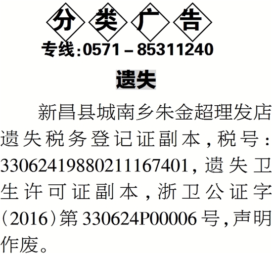 新昌县城南乡朱金超理发店遗失税务登记证副本,税号:33062419880211167401,遗失卫生许可证副本,浙卫公证字(2016)第330624P00006号,声明作废。