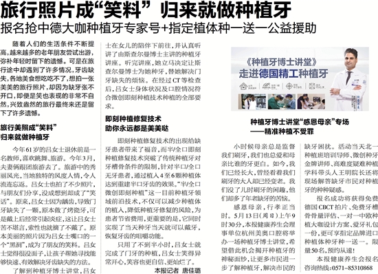 今年61岁的吕女士退休前是一名教师,喜欢跳舞、旅游。今年3月,夫妻俩跟团旅游去了。旅游中的秀丽风光,当地独特的风度人情,令人流连忘返。吕女士也拍了不少照片,与朋友们分享,没成想到却成了“笑话”。原来,吕女士因为龋齿,导致门牙缺失了一颗,原本做了烤瓷牙,可是戴上后经常引起炎症,这让吕女士苦不堪言,索性也就摘了不戴了。原本美丽的照片因为吕女士嘴口的一个“黑洞”,成为了朋友的笑料。吕女士觉得很没面子,让孩子帮她寻找能够快速、有效解决牙齿缺失的方法。